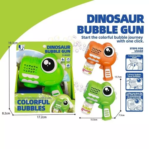 Кумедний пістолет із мильними бульбашками у вигляді динозавра одразу привертає увагу та дарує море позитивних емоцій. Яскравий дизайн робить іграшку особливо привабливою для малюків. Достатньо встановити флакон із розчином і натиснути кнопку, щоб у повітря здійнявся потік райдужних бульбашок. Зручна ручка дозволяє комфортно тримати пістолет під час активної гри. Така установка стане чудовим вибором для прогулянок, свят і веселих розваг на свіжому повітрі.